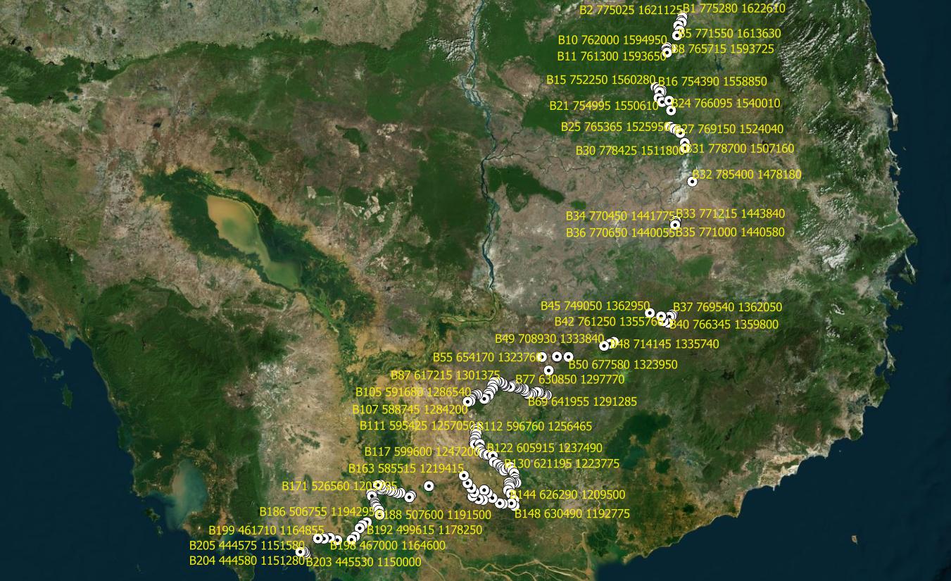 Cambodge Info publie les positions géographiques des bornes frontalières terrestres entre le Cambodge et le Vietnam selon le traité de 1985. Ce dernier a retenu 208 bornes à partir des cartes utilisant les projections Bonne/UTM à l’échelle 1/100000. Les coordonnées x,y UTM de chaque borne sont reportées sur la figure.